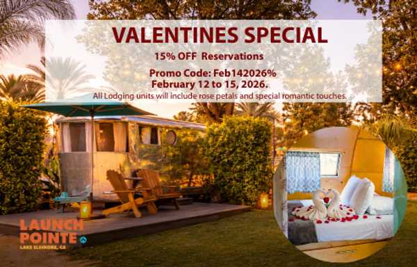 2025 CAMPSPOT AWARDS WINNER: Top Unique Campgrounds. Launch Pointe is an award-winning Southern California destination for Lake Elsinore RV camping and a 2024 Campspot Awards Winner for Top Midsize Campground. Designed with variety in mind, the property features seven thoughtfully created camping areas that range from peaceful, secluded stays to spacious lakeview lawns with convenient access to amenities, along with unique lodging options such as vintage trailers and yurts. Guests can enjoy family-friendly attractions including a canopy court playground, a splash pad, relaxing time in the hot tub, or on-site boat rentals for fun on the lake, and those who wish to fish should note that a valid fishing license is required. Whether unwinding beneath old pecan trees or embracing adventure on the water, Launch Pointe offers something for every style of camper—plan your stay today and experience the best of Lake Elsinore camping.